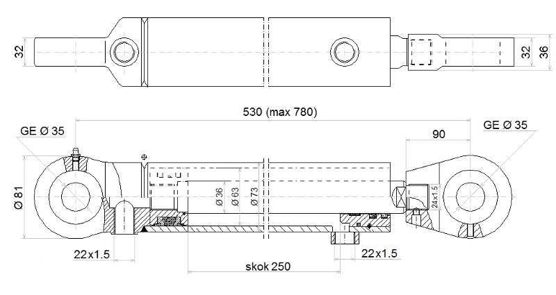 Obojstranný valec Hydrolider s zdvihom 200 mm, vnútorný priemer piestu 63 mm, priemer piestnej tyče 36 mm. Hlavy na posuvnych ložiskách, priemer kolíkov 35 mm. Vzdialenosť medzi osami zložených otvorov: 530 mm, rozložená: 780 mm.