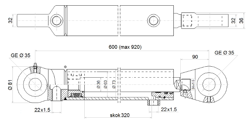Obojstranný valec značky Hydrolider s zdvihom 320 mm, vnútorný priemer piestu 63 mm, priemer piestnej tyče 36 mm. Hlavy na posuvnych ložiskách, priemer kolíkov 35 mm. Vzdialenosť medzi osami otvorov: 600 mm, rozložená: 920 mm.