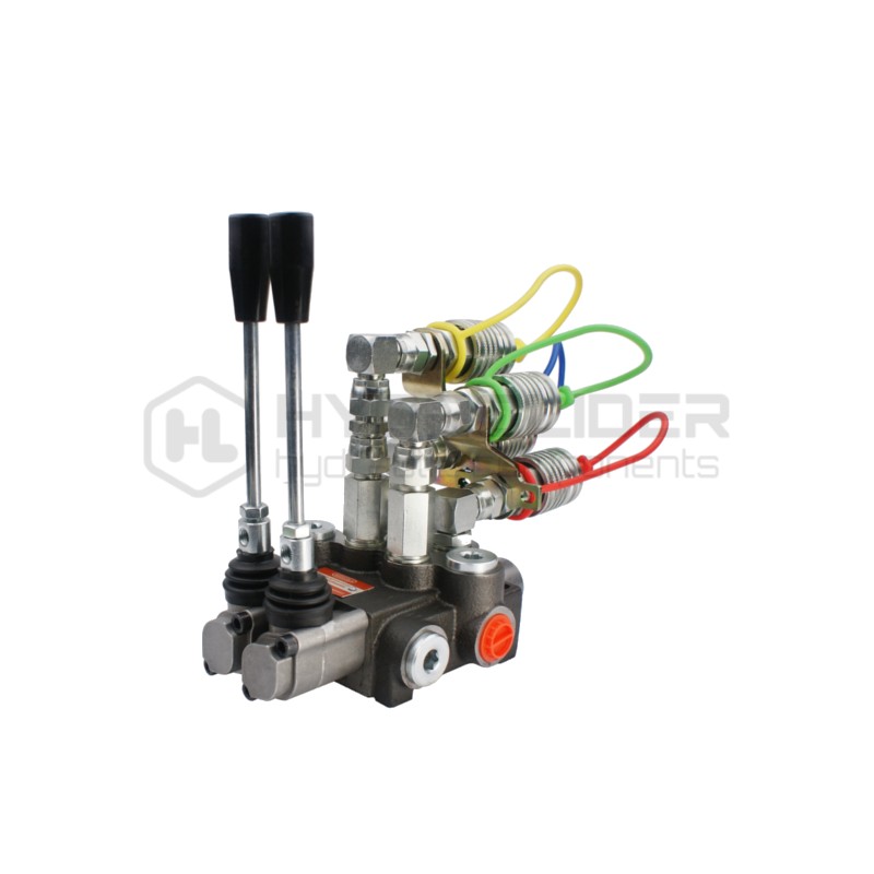 Badestnost hydraulický rozdeľovač, dvojsekciový prietoky do 40L /min.  Ovládanie jednočinných a dvojčinných valcov. Bezpečnostný ventil nastavená na 175bar. Obsahuje sadu zásuviek.