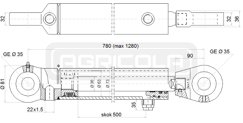 Jednočinný valec Hydrolider s výsuvom 500 mm, vnútorný priemer piestu 63 mm, priemer piestnej tyče 36 mm. Hlavy na posuvných ložiskách, priemer kolíkov 35 mm. Vzdialenosť medzi osami zložených otvorov: 780 mm, rozložená: 1280 mm.