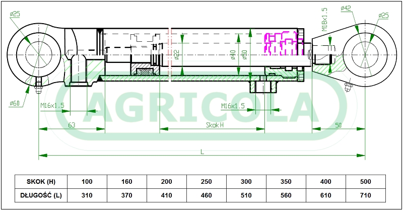Pôvodný pohon hydrolideru. Obojstranná prevádzka, pracovný zdvih 100mm, vnútorný priemer piestu 40 mm, priemer piestnej tyče 22 mm. Hlavy na posunutých ložiskách, priemer kolíkov 25 mm. Hlava zo strany rany piestnej tyče. Vzdialenosť medzi osami zložených otvorov: 310 mm, rozložená: 410 mm.