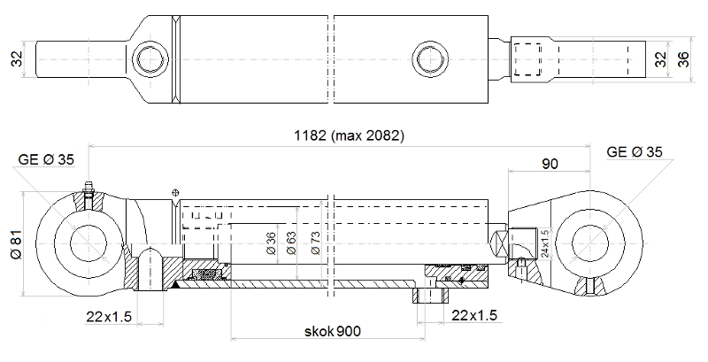 Obojstranný valec značky Hydrolider s zdvihom 900 mm, vnútorný priemer piestu 63 mm, priemer piestnej tyče 36 mm. Hlavy na posuvnych ložiskách, priemer kolíkov 35 mm. Vzdialenosť medzi osami zložených otvorov: 1182 mm, rozložená: 2082 mm.