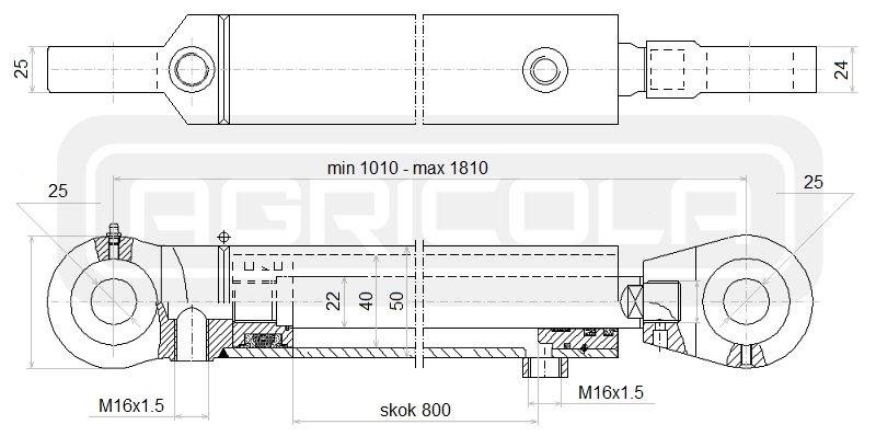 Dvojčinný valec s výsuvom 800mm, vnútorný priemer piestu 40 mm, priemer piestnej tyče 22 mm. Hlavy na posuvných ložiskách, priemer kolíkov 25 mm. Vzdialenosť medzi osami zložených otvorov: 1010 mm, rozložená: 1810 mm.