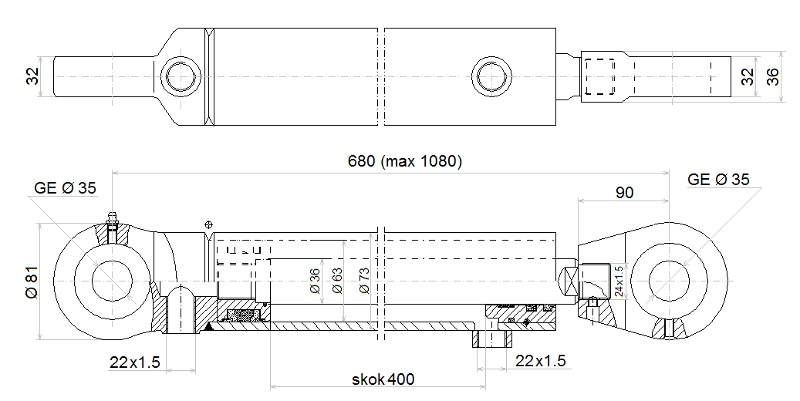 Obojstranný valec značky Hydrolider s zdvihom 400 mm, vnútorný priemer piestu 63 mm, priemer piestnej tyče 36 mm. Hlavy na posuvnych ložiskách, priemer kolíkov 35 mm. Vzdialenosť medzi osami zložených otvorov: 680 mm, rozložená: 1080 mm.